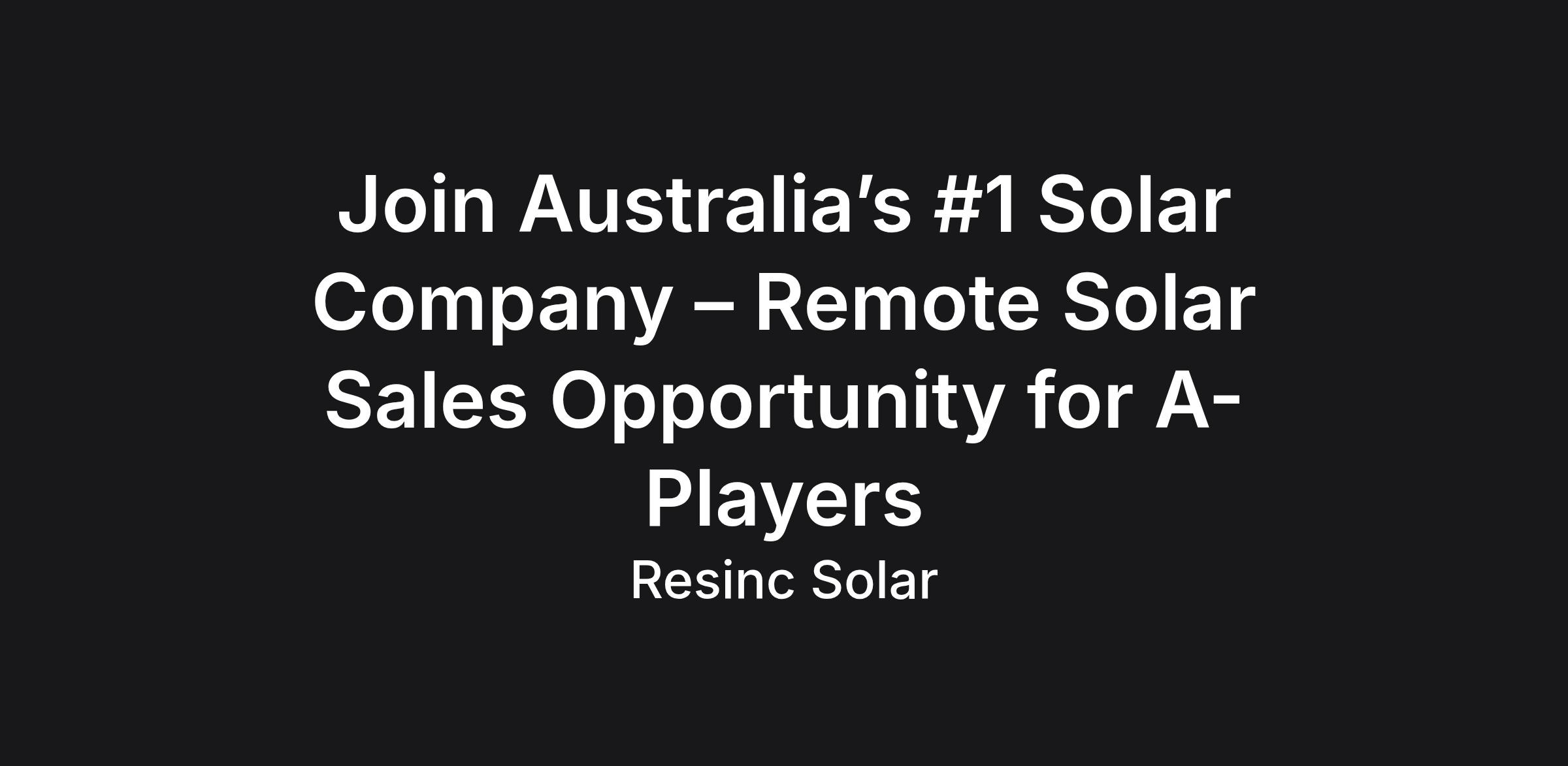 Are you sick of inconsistent appointments in your calendar? Tired of spending 10+ hours a week driving to meetings or working for a company with questionable integrity? If you’re a high performing professional with sales experience or an A-player (with a proven track record) from another industry ready to dominate - join RESINC Solar, Australia’s highest-rated and most awarded solar company, and take your career to the next level.